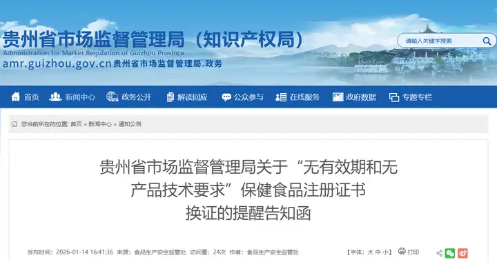 根据《市场监管总局 国家卫生健康委 国家中医药局关于发布〈允许保健食品声称的保健功能目录 非营养素补充剂(2023年版)〉及配套文件的公告》《市场监管总局发布在产在售“无有效期和无产品技术要求”保健食品集中换证审查要点》《市场监管总局办公厅印发关于保健食品换证过渡期届满有关问题的复函》,为指导我省“无有效期和无产品技术要求”保健食品注册证书平稳、有序、及时换证,现将有关事项再次提醒告知如下: