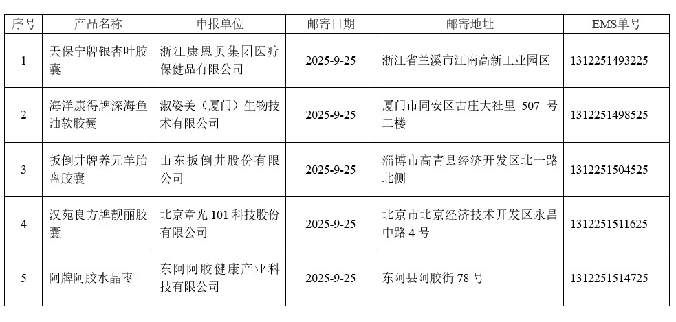 2025年9月25日保健食品批件(决定书)邮寄详情单