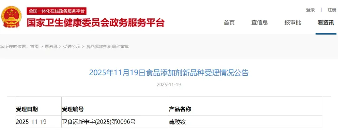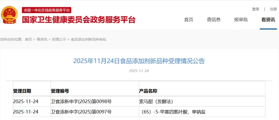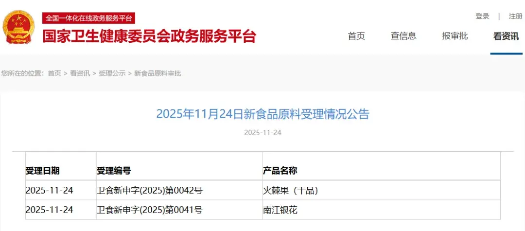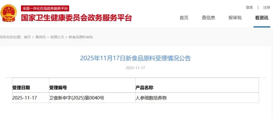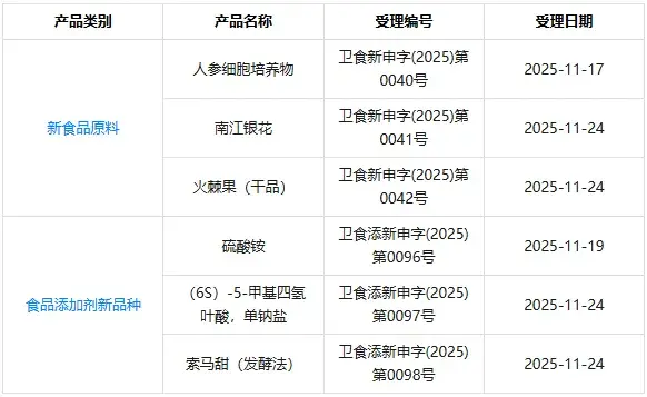 国家卫生健康委员会政务服务平台近期发布受理公告,其中新食品原料-新增受理3种:人参细胞培养物、火棘果(干品)、南江银花;食品添加剂新品种-新增受理3种:硫酸铵、索马甜(发酵法)、(6S)-5-甲基四氢叶酸,单钠盐。