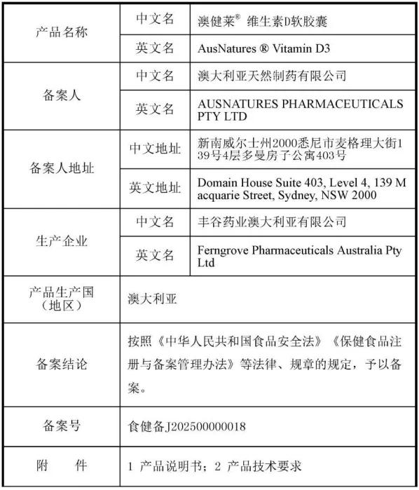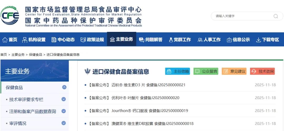 2025年11月18日,国家市场监督管理总局食品审评中心发布了4款进口保健食品备案信息,具体产品信息如下。
