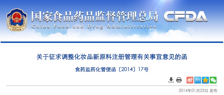 为保障消费者健康权益,鼓励企业积极创新,依据《化妆品卫生监督条例》的相关规定,我司组织起草了《关于调整化妆品新原料注册管理有关事宜的通告》(征求意见稿)。现公开征求意见,请于2014年2月20日前将有关意见反馈我司。