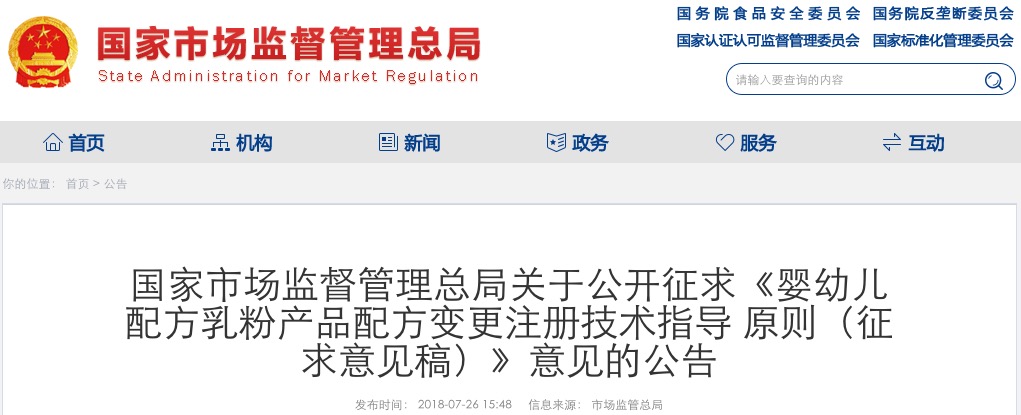 国家市场监督管理总局关于公开征求《婴幼儿配方乳粉产品配方变更注册技术指导 原则(征求意见稿)》意见的公告