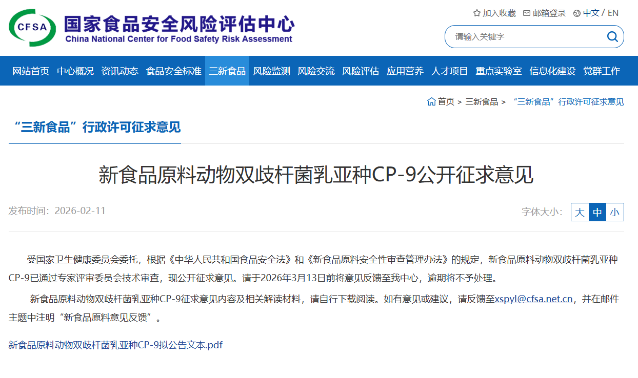 受国家卫生健康委员会委托,根据《中华人民共和国食品安全法》和《新食品原料安全性审查管理办法》的规定,新食品原料动物双歧杆菌乳亚种CP-9已通过专家评审委员会技术审查,现公开征求意见。请于2026年3月13日前将意见反馈至我中心,逾期将不予处理。